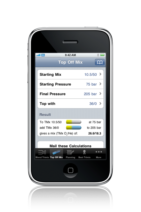 Technical divers abide by the rule of thirds to help them remain safe. Divers may want to top off their previously used cylinders with air from the boats compressor or even ‘transfill’ from another cylinder to take advantage of the remaining gas in their cylinders. The Top Off Mix tool will tell you what mix to expect based on a given starting pressure and starting mix after topping with air or some other mix.